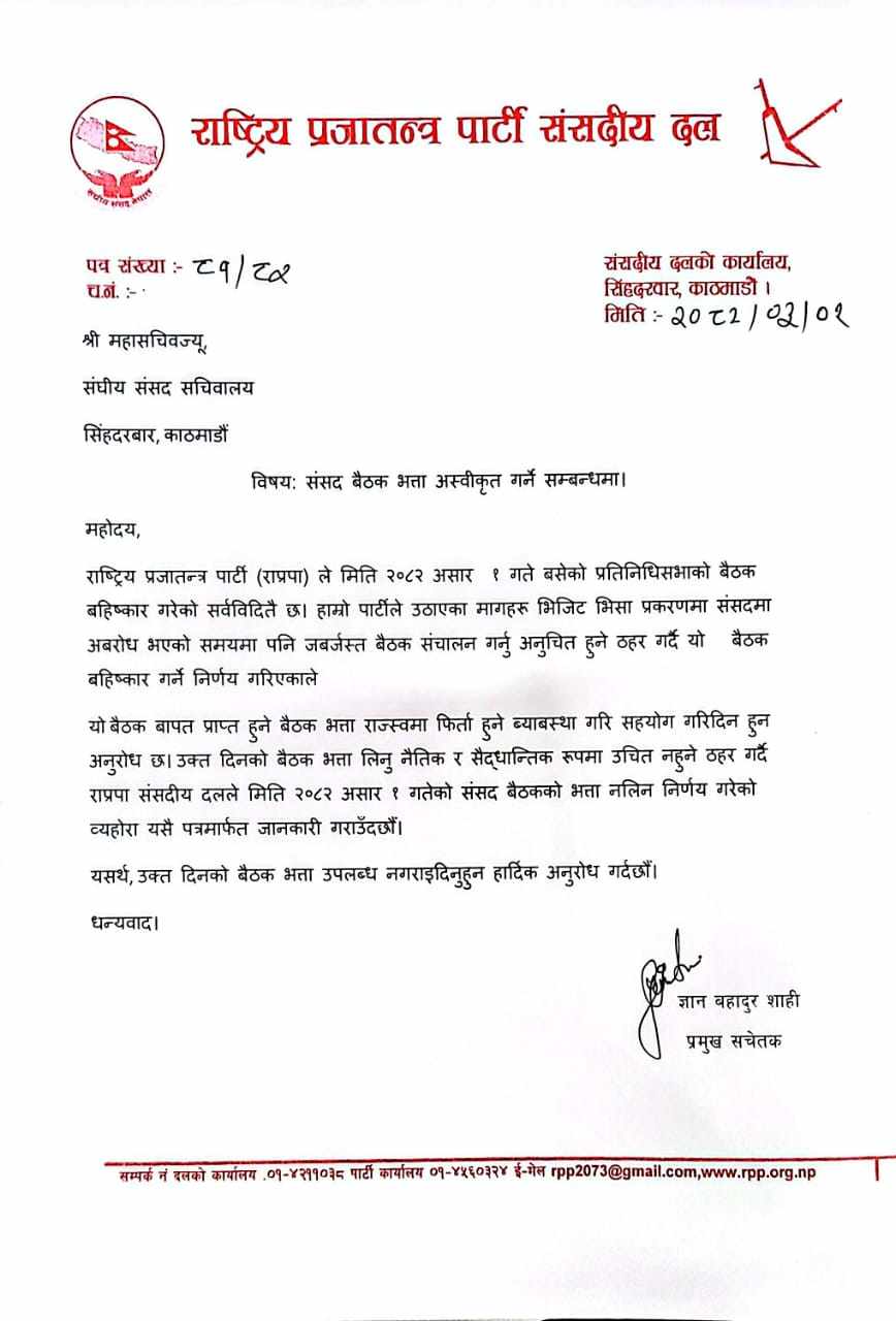 काठमाडौं – राष्ट्रिय प्रजातन्त्र पार्टी (राप्रपा) संसदीय दलले असार १ गते प्रतिनिधिसभा बहिष्कार गरेको दिनको बैठक भत्ता अस्वीकृत गर्ने निर्णय गरेको छ।