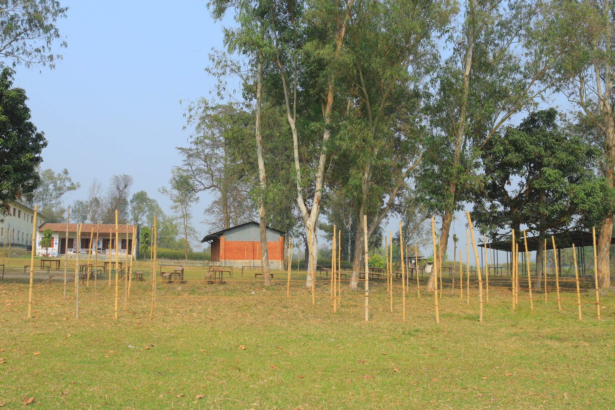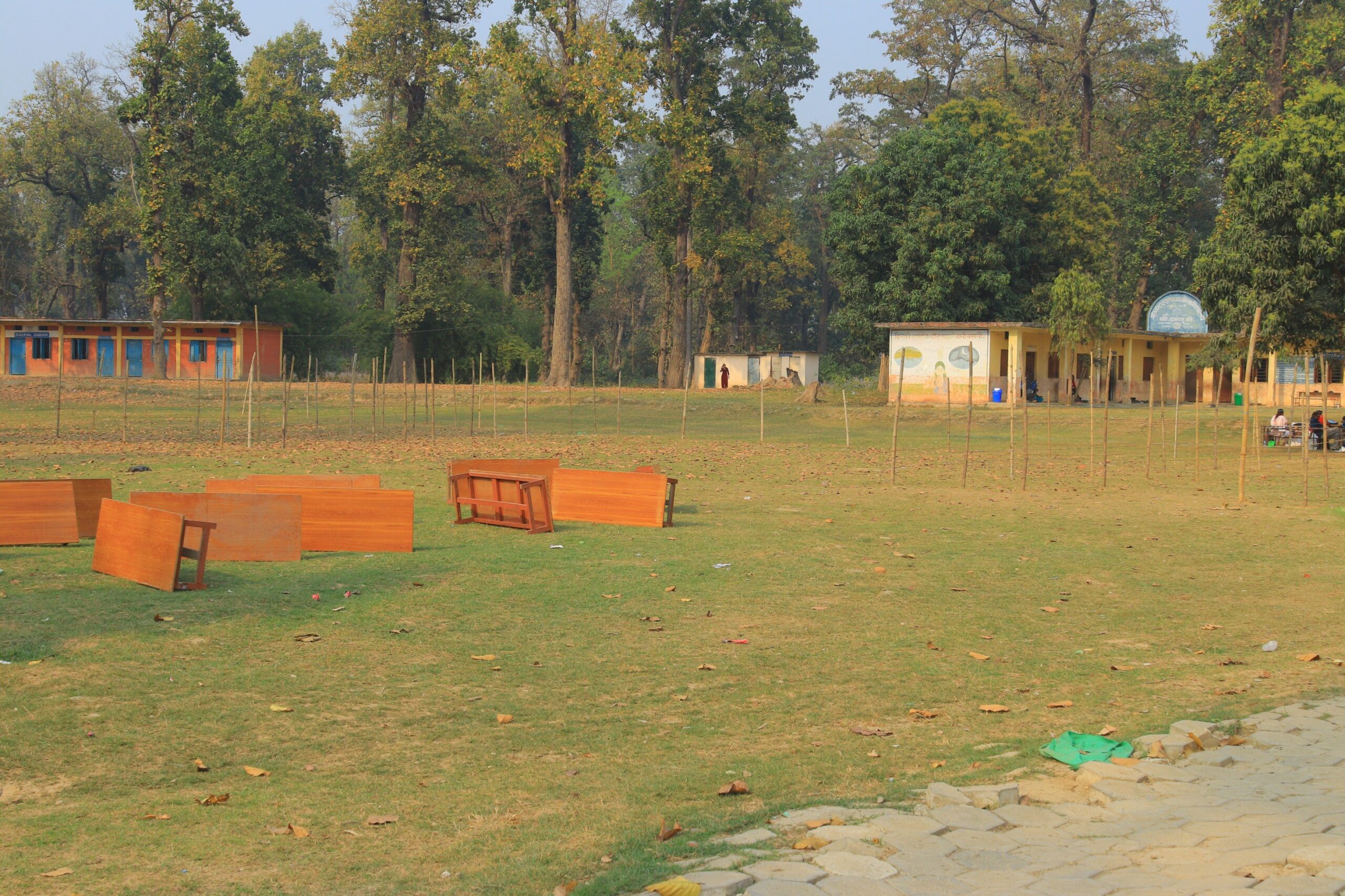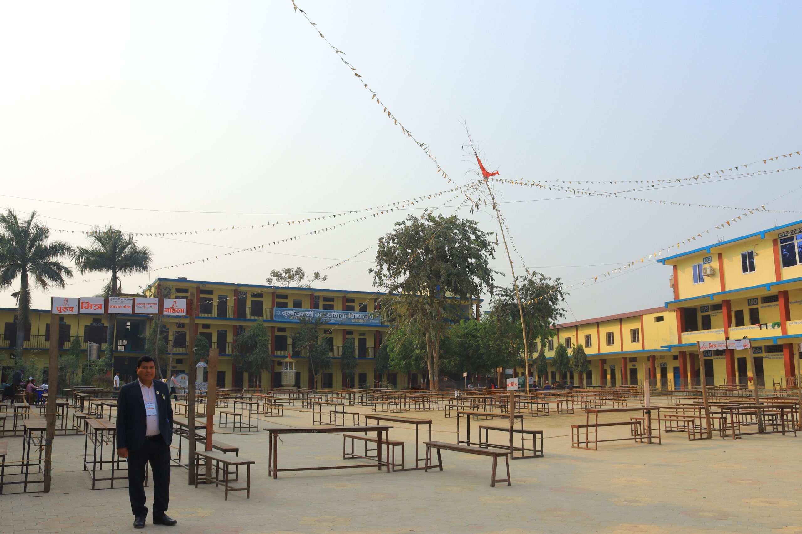 मतदान केन्द्रमा बाँसका ब्यारिकेडहरू निर्माण गरिएका छन्, जसले मतदाताहरूलाई लाइनमा बसेर मतदान गर्न सहज बनाउनेछ।