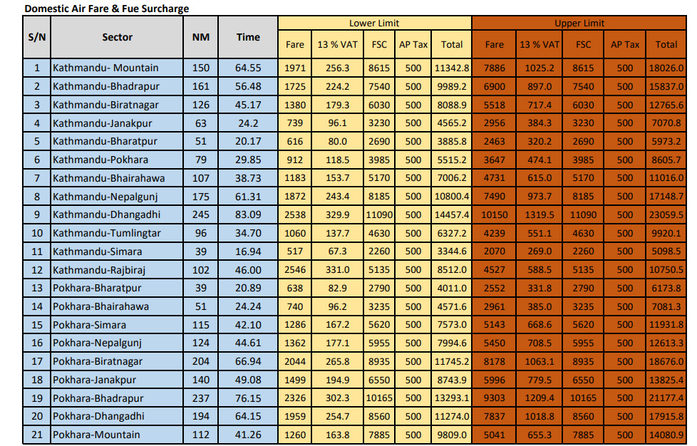 यसैबीच अब काठमाडौंबाट हुने पर्वतीय (माउन्टेन) उडानमा ४२ सय ५५ रुपैयाँले वृद्धि भई ८ हजार ६१५, काठमाडौं-सुर्खेतमा ४२ सय ८५ ले वृद्धि भई ८ हजार ६५७, काठमाडौं-नेपालगन्ज रुटमा ४ हजार ४५ ले वृद्धि भई ८ हजार १८५, काठमाडौं– भद्रपुर रुटमा ३७ सय २५ ले वृद्धि भई ७५ सय ४०, काठमाडौं–पोखरा रुटमा १९ सय ७० ले वृद्धि भई ३९ सय ८५, काठमाडौ–जनकपुर रुटमा १६ सयले वृद्धि भई ३२ सय ३०, काठमाडौं-भरतपुर रुटमा १३ सय ३० रुपैयाँले वृद्धि भई २६ सय ९०, काठमाडौं- विराटनगर रुटमा २९ सय ८० रुपैयाँले वृद्धि ६ हजार २०, काठमाडौं-भैरहवा रुटमा २५ सय ५५ रुपैयाँले वृद्धि भई ५१ सय ७० र काठमाडौं-सिमरा रुटमा ११ सय २० रुपैयाँले भाडा वृद्धि भइ २२ सय ६० रुपैयाँ फ्लयु सर चार्ज मात्रै बढेको छ ।