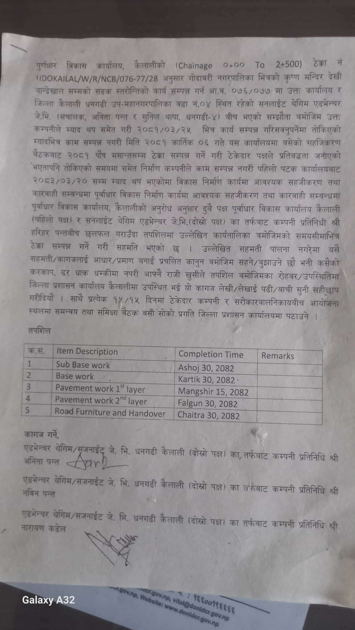 त्यसपछि बाध्य भएर ठेकेदारले पूर्वाधार विकास कार्यालय कैलालीमा २०८२ चैत्र १५ गतेसम्म कृष्णमन्दिर बान्द्रेखाल सडक निर्माण सम्पन्न गरी हस्तान्तरण गर्ने सम्झौता गरेका थिए । तर हालसम्म काम अघि बढ्न सकेको छैन । सुदूरपश्चिम प्रदेश गौरवको योजनाका रूपमा रहेको उक्त सडकअन्तर्गत कृष्णमन्दिर बान्द्रेखाल सडक निर्माणको काम ठेकेदारको लापरबाहीका कारण सुस्त छ ।