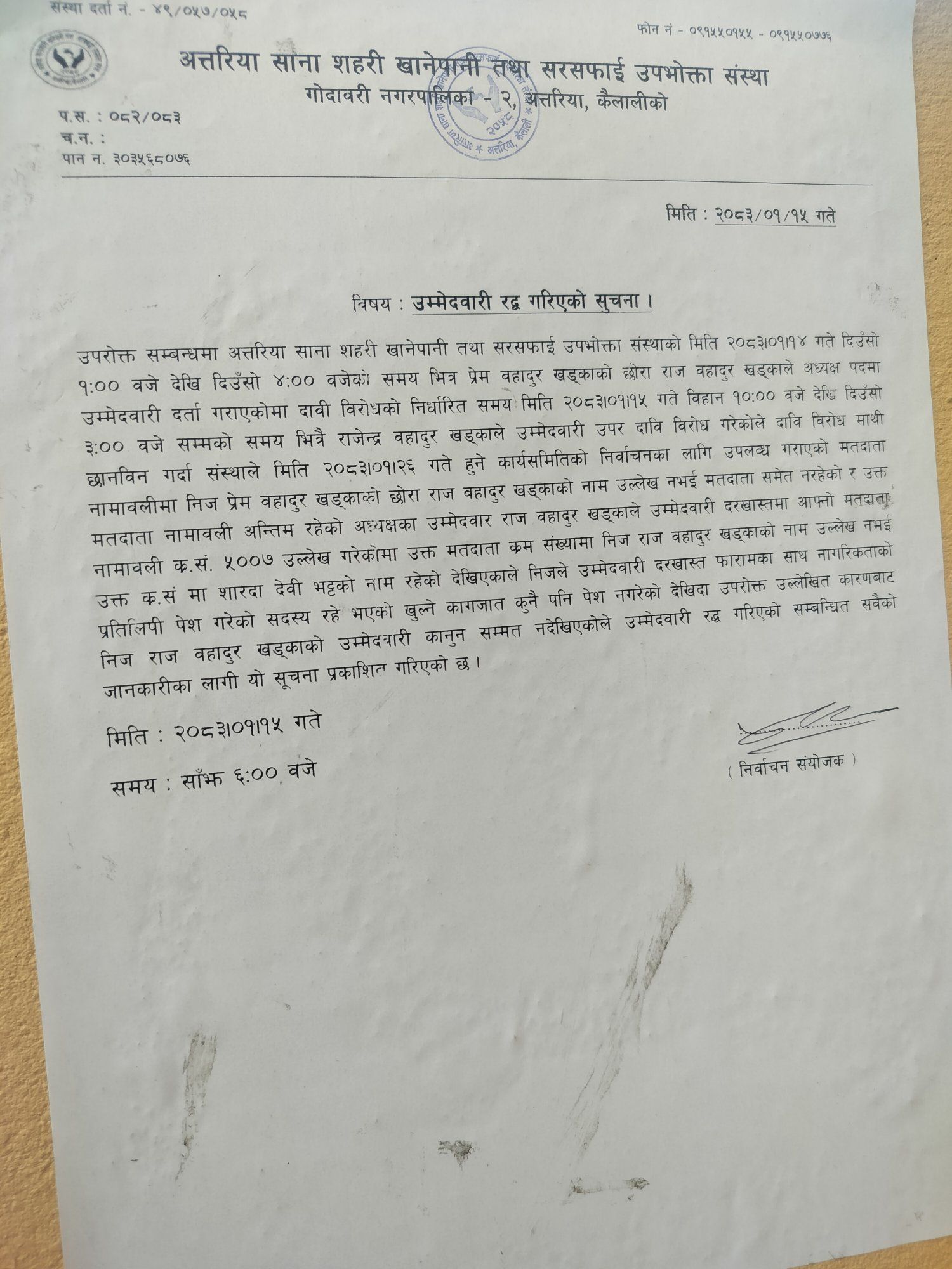 अत्तरिया – कैलालीको गोदावरी नगरपालिका–२ स्थित अत्तरियामा रहेको अत्तरिया साना शहरी खानेपानी तथा सरसफाइ उपभोक्ता संस्थाको वैशाख २६ गते हुने निर्वाचनको लागी अध्यक्ष पदमा उम्मेदवारी दर्ता गरेका राज बहादुर खड्काको उम्मेदवारी रद्ध भएको छ।
